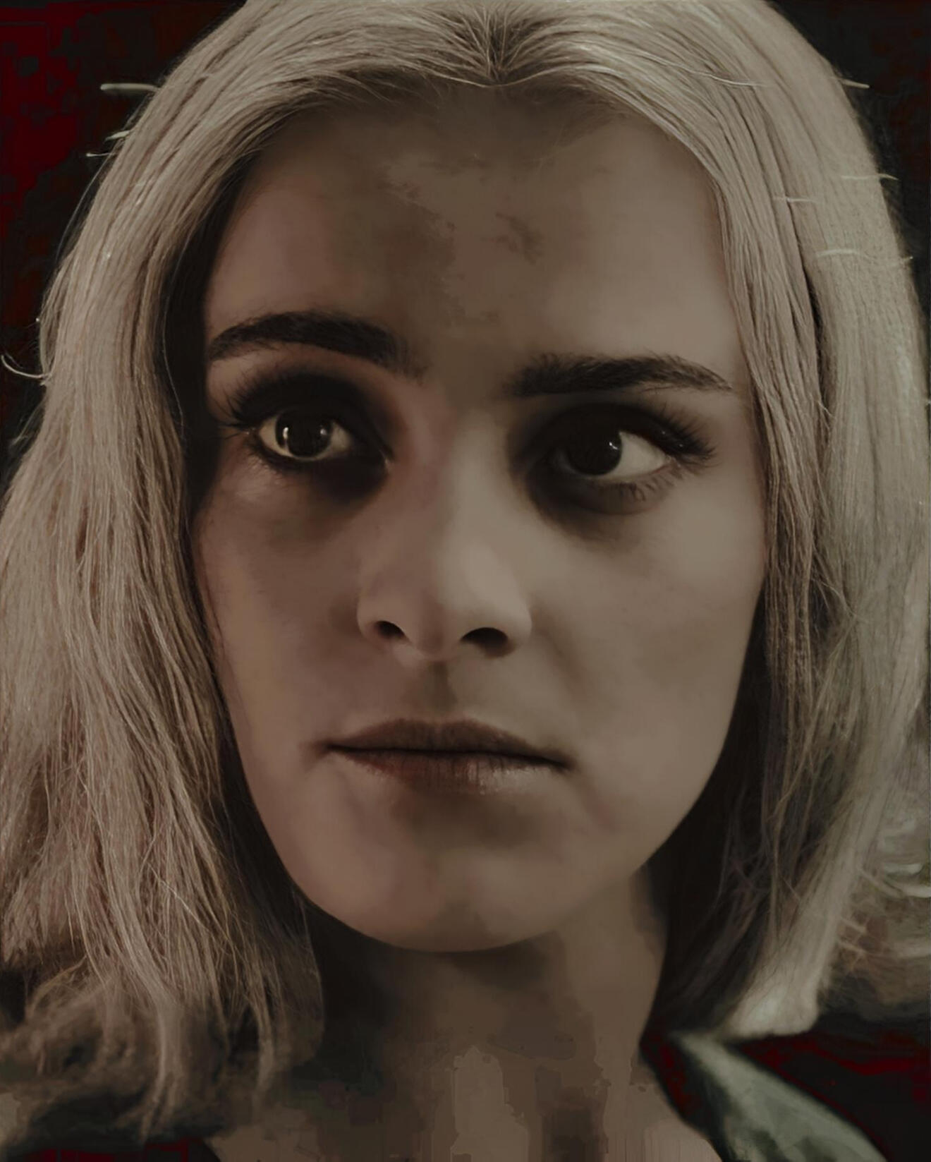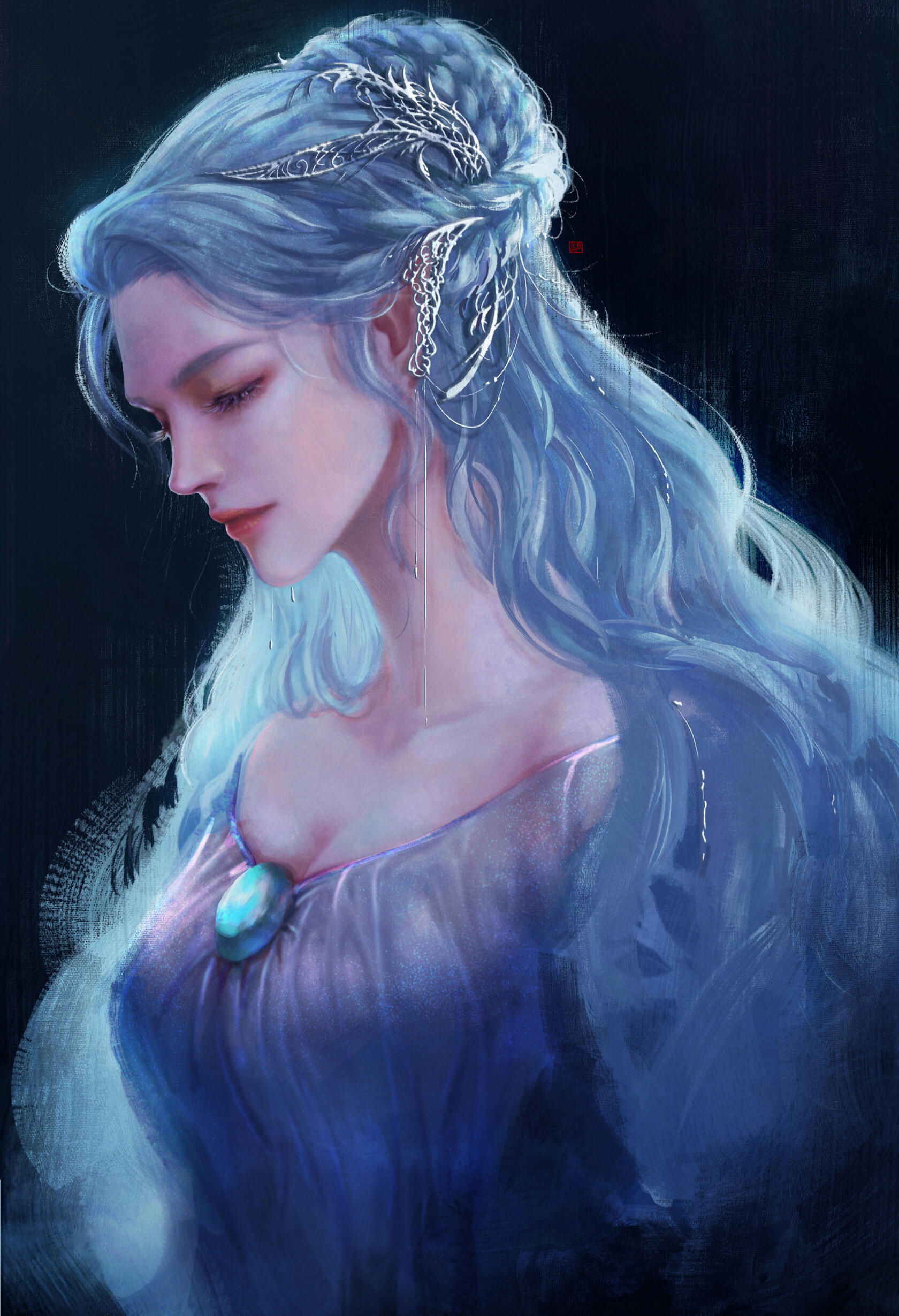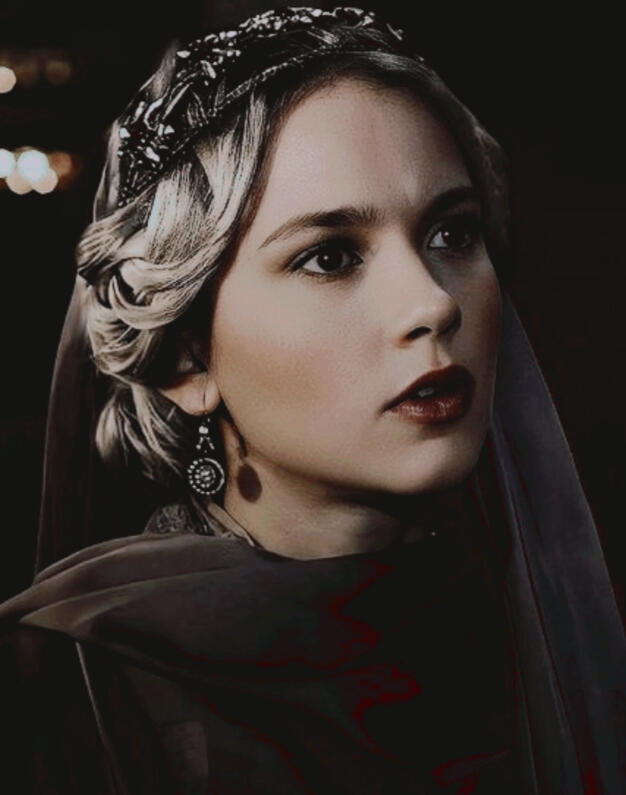 Fearful MBTI ISTP HEIGHT 6' HAIR silver & blonde EYES silver MARKS & SCARS PHYSICAL DESCRIPTION Wavy, long, silver blonde hair typically put in half up half down styles with braids which crown her head. She wears lilacs, greys and blues with red accents, floaty layers, puffy sleeves, but very simplistic. Her eyes are grey and large, with a tendency to seem as if they're looking past you. She wears two rings, one on each hand on the middle finger. She also wears metallic things in her hair, silver leaves and pins of butterflies and such. In the sun, her hair shines more golden, and is seen as simliar to her mothers. FACE CLAIM Phia Saban ( second age ) ; Susannah Harker ( third age ) PARENTS