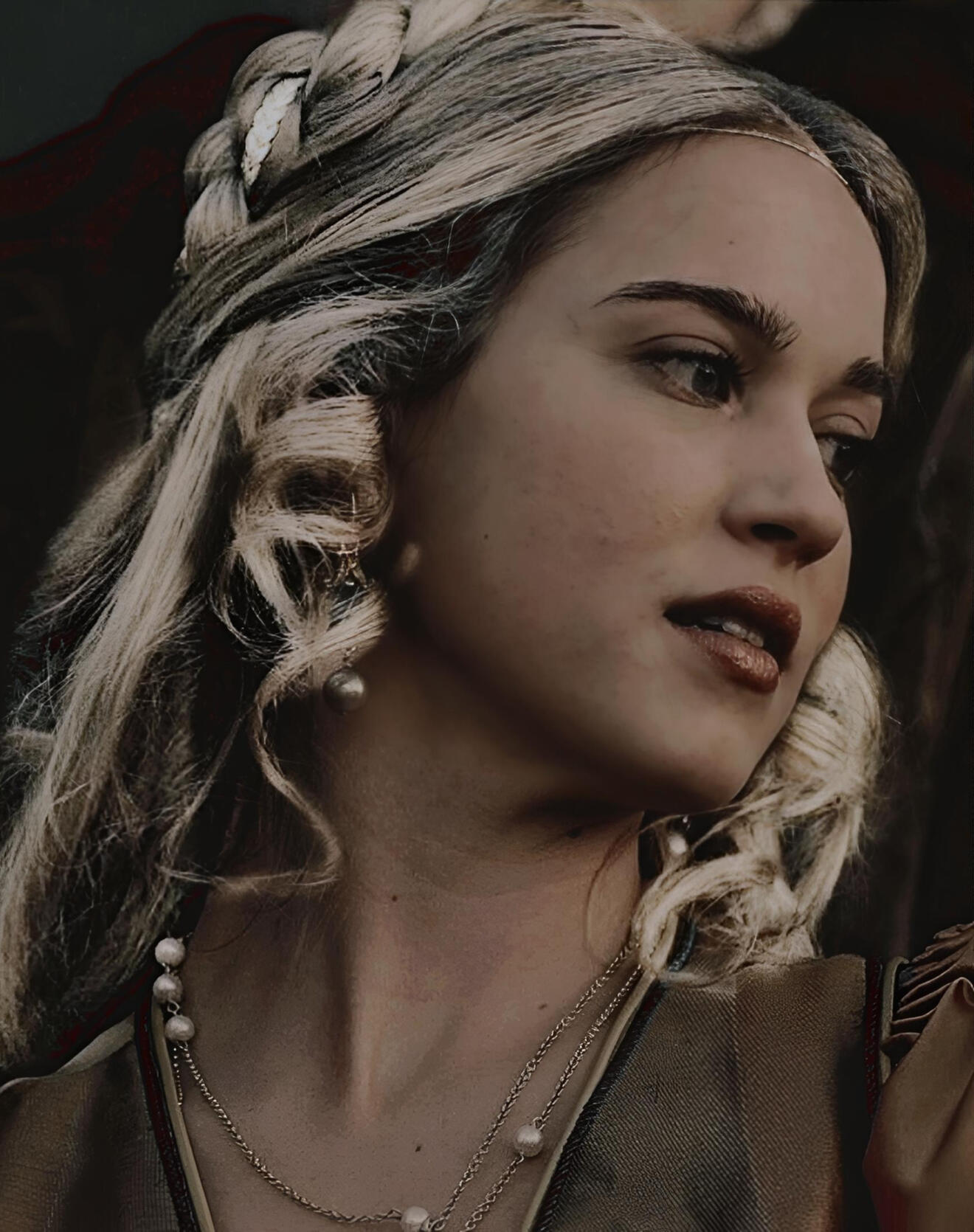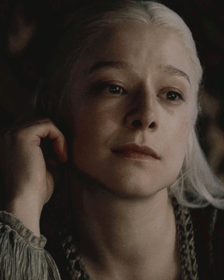 Fearful MBTI ISTP HEIGHT 6' HAIR silver & blonde EYES silver MARKS & SCARS PHYSICAL DESCRIPTION Wavy, long, silver blonde hair typically put in half up half down styles with braids which crown her head. She wears lilacs, greys and blues with red accents, floaty layers, puffy sleeves, but very simplistic. Her eyes are grey and large, with a tendency to seem as if they're looking past you. She wears two rings, one on each hand on the middle finger. She also wears metallic things in her hair, silver leaves and pins of butterflies and such. In the sun, her hair shines more golden, and is seen as simliar to her mothers. FACE CLAIM Phia Saban ( second age ) ; Susannah Harker ( third age ) PARENTS